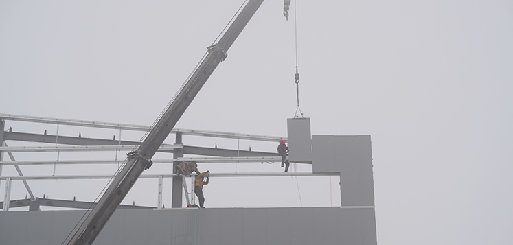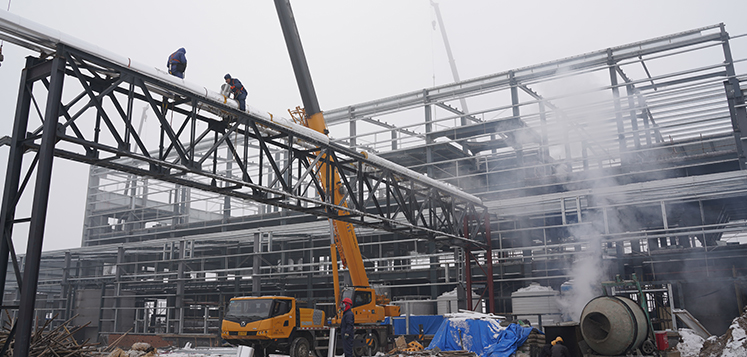 2020年12月,工人們冒著嚴寒在安裝鉬酸銨車間的外墻保溫板。